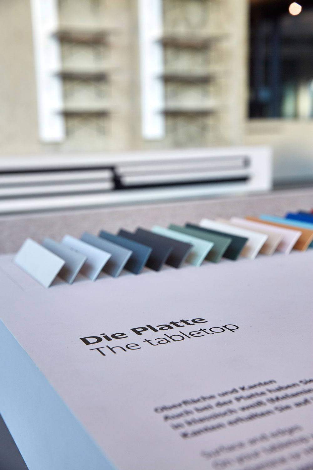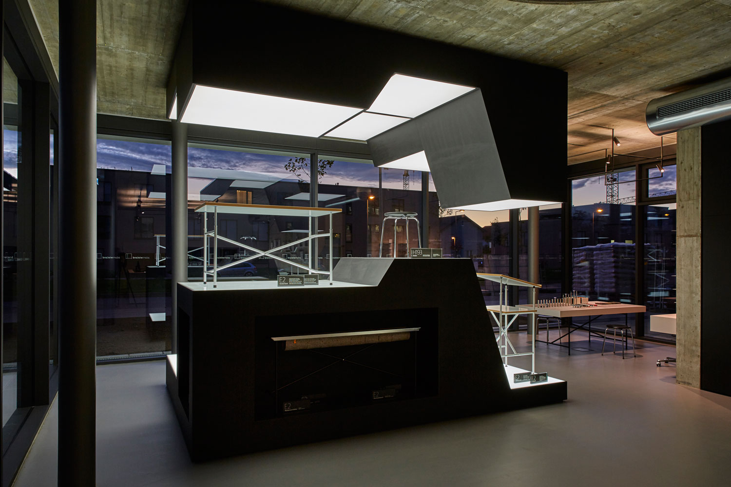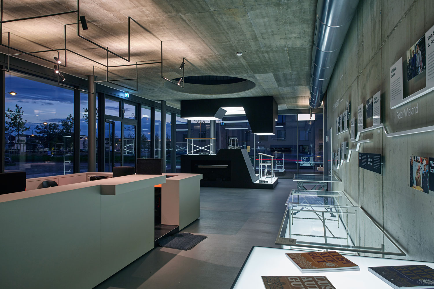 Die Glasfassade legt den Gestaltungsschwerpunkt auf die gleichwertige Innen- und Außenraumwirkung der Ausstellungsmöbel, wie auch der Gebrauchsmöbel. Dieser Anspruch wird erfüllt durch die Ausführung aller Möbel in einer Linoleum Oberfläche, welche die Hochwertigkeit der Produkte betont, und den hinterleuchteten Präsentationsflächen, welche die E2-Familie gerade in den Abendstunden besonders erstrahlen lassen. Alle verarbeiteten Materialien zitieren die Metallwerkstatt Adam Wieland und ihr Sortiment. Selbst das Raumlicht ist eigens auf die Adam Wieland Kollektion abgestimmt und in Anlehnung an den E2 gestaltet.