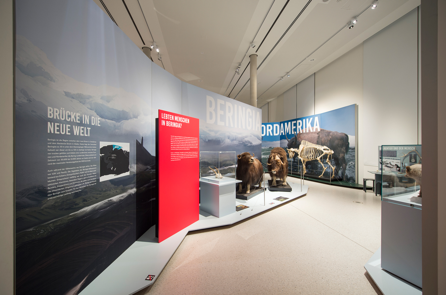 Der Besucher wird zunächst über einen Weg, die Beringstraße, in die Ausstellung geführt. Danach öffnet sich der Raum und ein Highlight wird sichtbar: Eine großformatige Leuchtwand mit der Darstellung der damaligen Megafauna in Lebensgröße.