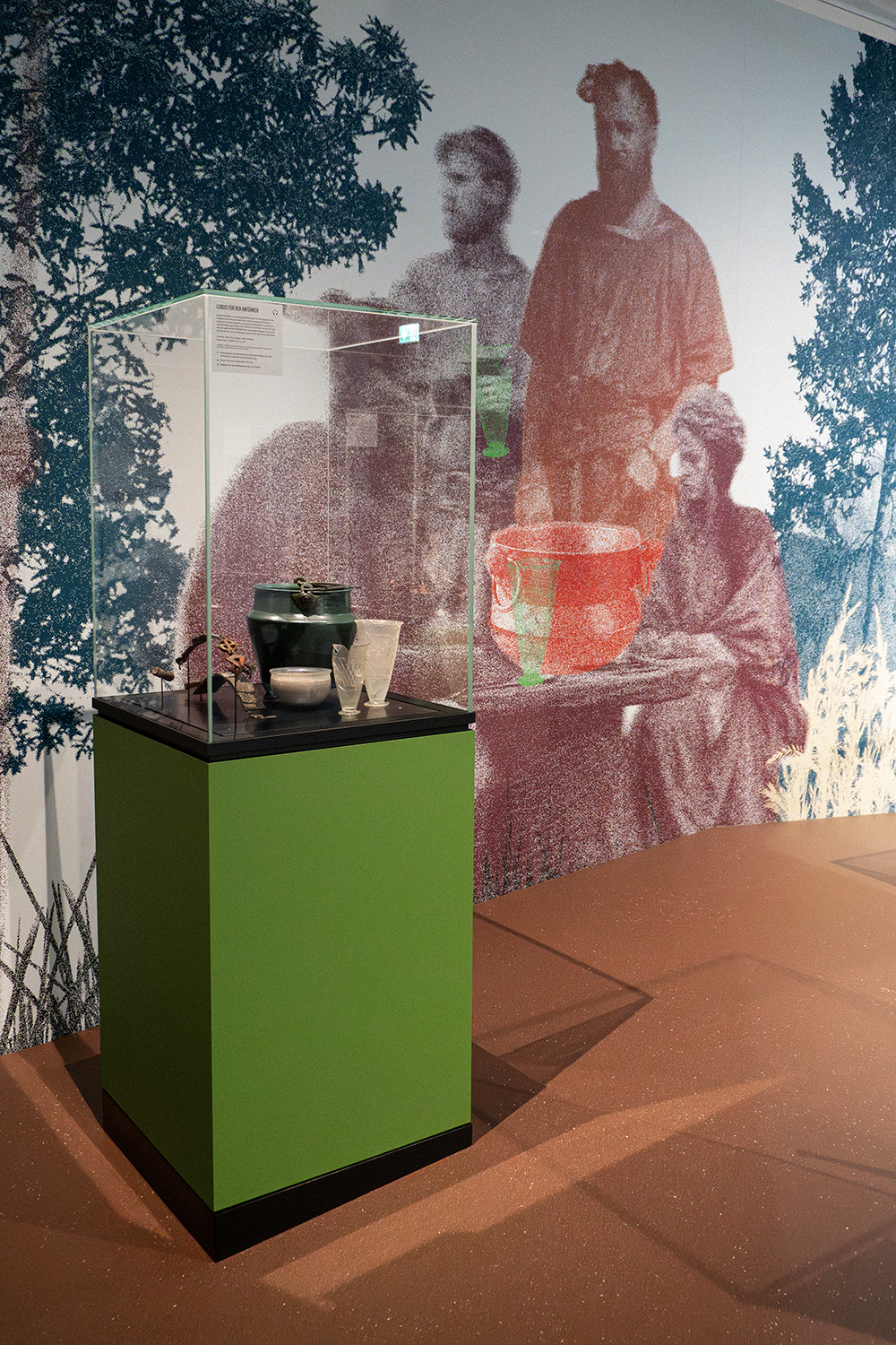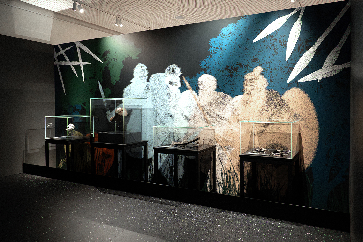 Unsere Ausstellungsgestaltung folgt einer klaren räumlichen und visuellen Struktur. Die drei zentralen Themenbereiche sind durch unterschiedliche Bodenbeläge, mit variierenden Niveaus, Raummodulen und großformatigen Grafiken voneinander abgesetzt. Klare typografische Systeme, vielschichtige Wandbilder und farblich gegliederte Zonen leiten die Besucherinnen und Besucher intuitiv durch wechselnde Perspektiven.