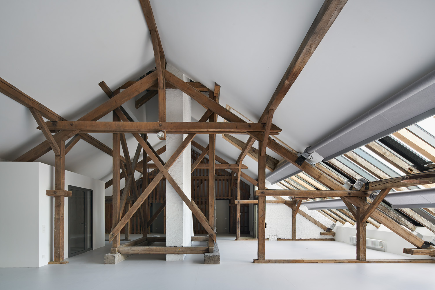 Der hohe Dachstuhl mit dem Holztragwerk, ausgebildet als Pfettendach, hat eine beeindruckende Raumwirkung. Aus brandschutztechnischen Gründen wird für die Nutzung des Dachgeschosses das Dach des Aufzugsschachtes um ca. 1,00 m angehoben und die Dachkonstruktion neu aufgesetzt.