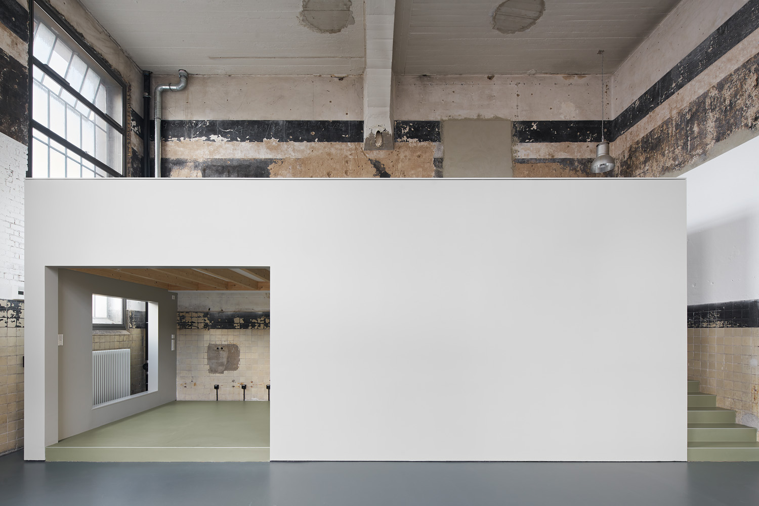 Die neue Nutzung im Innenraum erfolgt entsprechend der Potenziale und Möglichkeiten der vorgefundenen Räume. Daraus entstanden Ateliers vorwiegend in den unteren Geschossen sowie Büroräume unterschiedlicher Größen in den oberen Stockwerken.