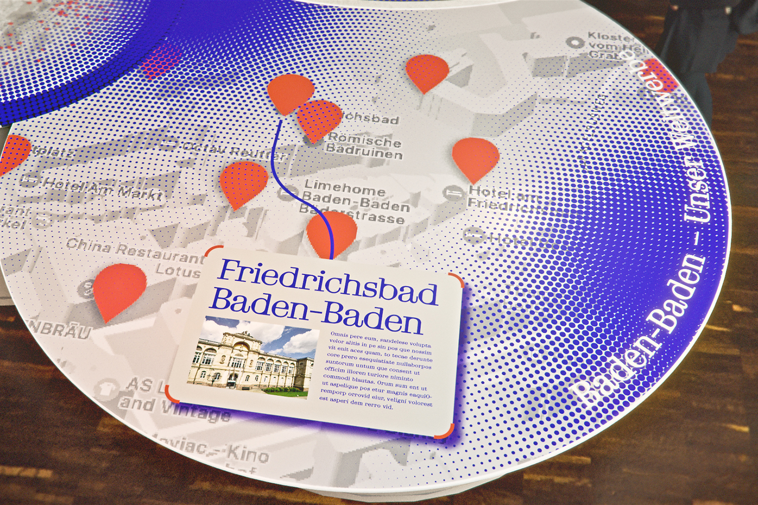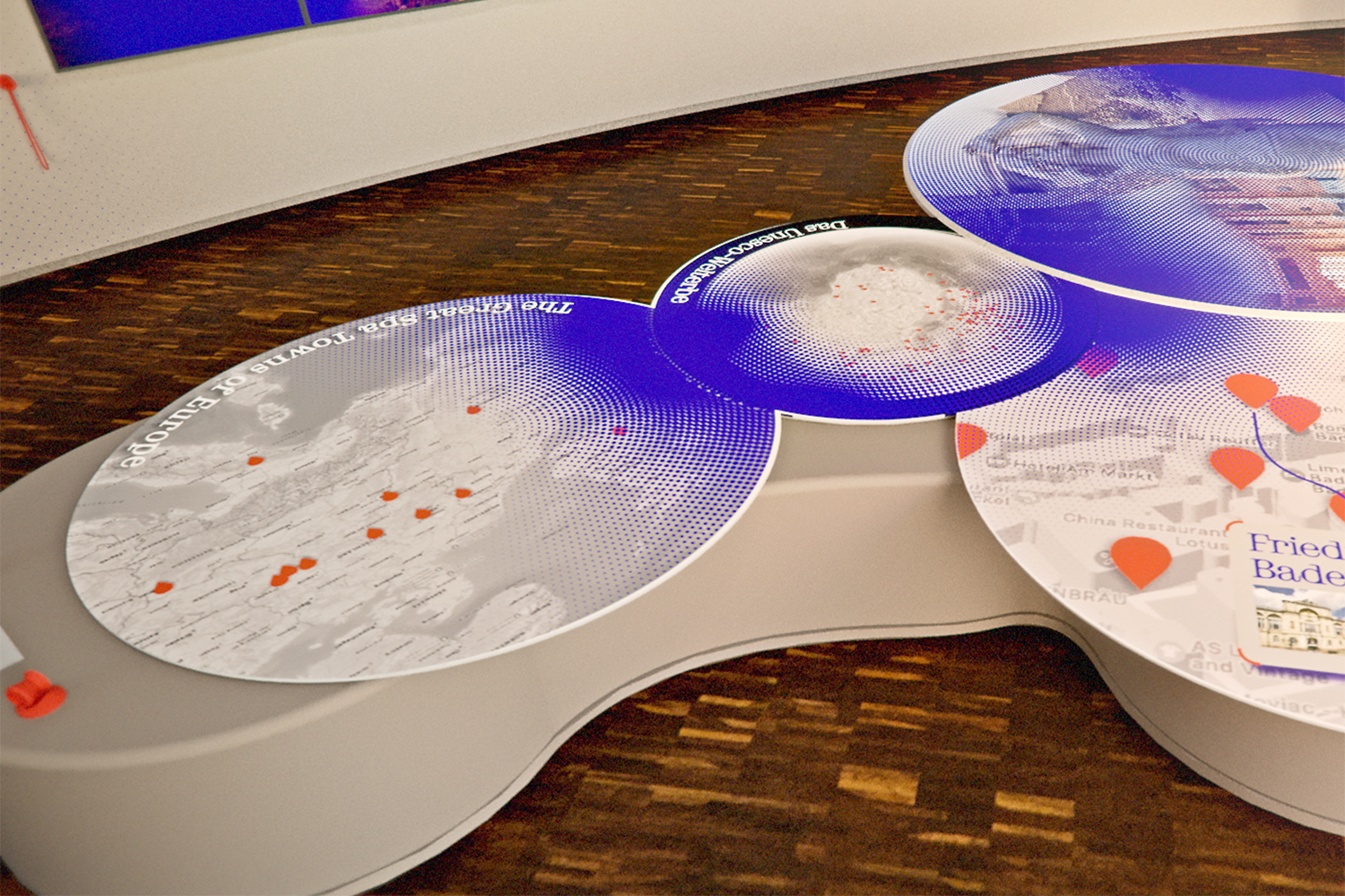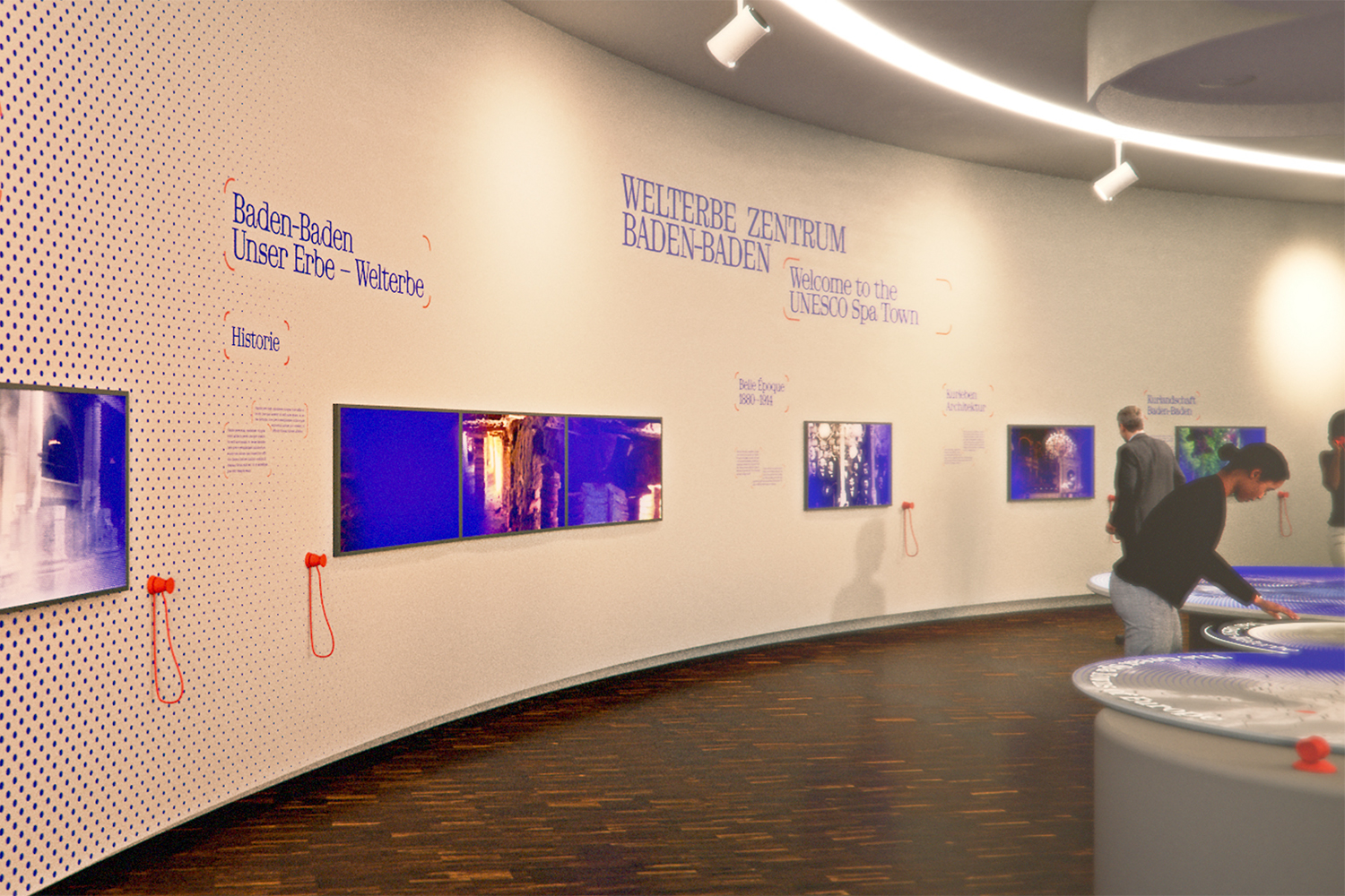 Im Eingangsbereich erwartet die Gäste eine multimediale Installation mit Projektionsfläche und interaktiven Touchscreens. Hier erhalten sie einen ersten Überblick über die Themen UNESCO weltweit, Great Spa Towns of Europe und Baden-Baden. Anschaulich, übersichtlich und einladend. Auf der gebogenen Rückwand werden die Inhalte klar strukturiert präsentiert und durch digitale Vertiefungsebenen ergänzt.