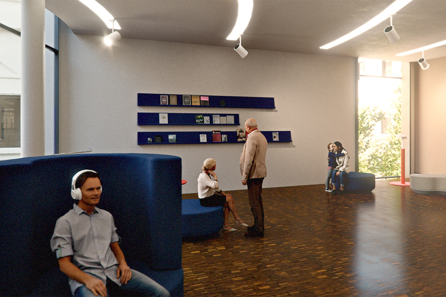 Das Obergeschoss bietet Raum zum Verweilen, Lernen und Erleben. Unterschiedliche Medienstationen und offene Sichtachsen schaffen ein helles, inspirierendes Raumgefühl. Ein modulares Stellwandsystem und flexible Möbel machen den Bereich vielseitig nutzbar – ob für Sonderausstellungen, Workshops oder Veranstaltungen.