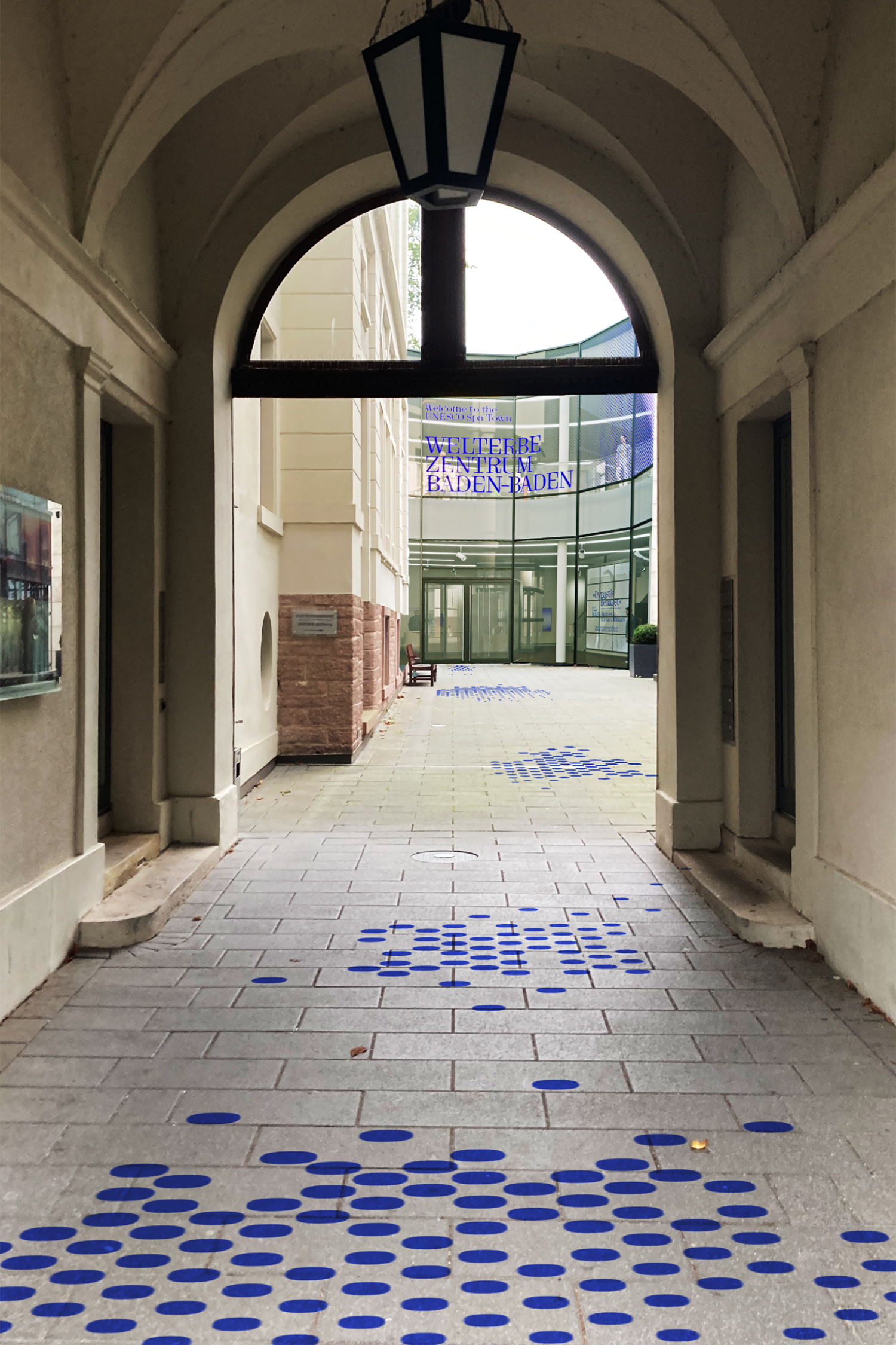 Unser Leitsystem führt Besucherinnen und Besucher intuitiv und unaufdringlich von der Lichtentaler Allee bis zum Haupteingang des Welterbe Zentrums. Die offene Glasfassade gibt schon von außen den Blick frei auf die einladende Innenarchitektur und die zweigeschossige Ausstellung. Ein besonderes Highlight ist die große Videowall, die den Hof atmosphärisch belebt und auf Veranstaltungen hinweist.